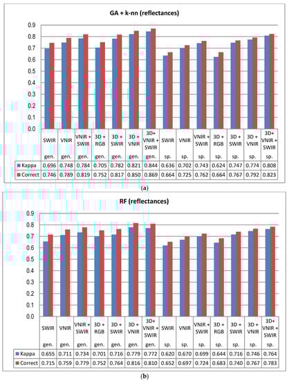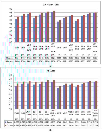 5]. In this study the GA procedure used in combination with a k-nn classifier provided otherwise consistently better results in tree species and genus recognition than RF, with the exception of 3D+RGB (the dataset having the lowest number of features) where RF performed slightly better. Thus, the GA algorithm applied here was found to be a viable tool for finding an appropriate set of features for this task, especially in a very high-dimensional feature space, such as that tested in this study. Both classification methods applied in this study have feature selection components which are stochastic by nature, which means that there is a random effect in their results. This effect was apparent especially in those tree species which had few test trees, and the user’s and producer’s accuracy of these species varied highly between 0–1 with different feature combinations (see