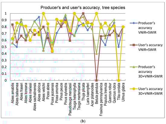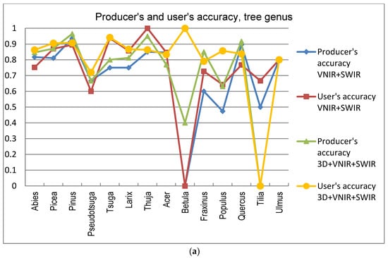 65] with test material of even higher species diversity (15 species) using LiDAR data, but their best recognition (over 90%) was achieved by combining LiDAR data from both leaf-on and leaf-off seasons. However, with single-season data, the species recognition accuracy was approx. 80%, and the leaf-off data performed markedly better than data from the leaf-on season [