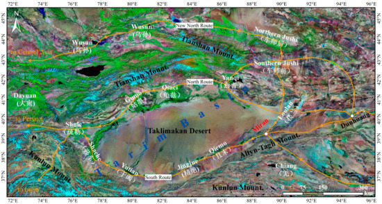 The Silk Road was an ancient network of trade routes that for centuries were central to cultural communication and interaction originally through vast regions of Eurasia connecting China and the West. In June 2014, UNESCO designated the Chang’an-Tianshan Corridor of the Silk Road as a World Cultural Heritage Site. Communications with the Western Regions (including today’s Xinjiang Uyghur Autonomous Region in China and Eastern Central Asia) started only in the time of Han Emperor Wu (141 B.C.–87 B.C.) [1]. Originally, there had been thirty-six oasis kingdoms, but afterwards these were gradually divided into more than fifty [2]. During the period of Han Emperor Wu, the ancient Silk Road from Dunhuang to Central Asia, named the Western Regions Section, was extended through the Tarim Basin between the Tianshan Mountains and the Kunlun Mountains [3], and generally divided into three parallel lines (Figure 1).