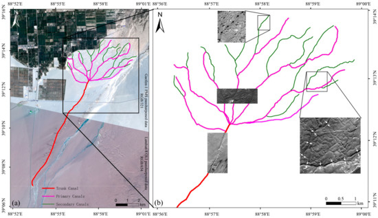 Intact TICs can indicate the skeletal structure of the Miran tuntian system. They are often buried beneath layers of sand and cannot be easily observed on the ground. However, their traces can be observed from space, especially in VHR imagery (Figure 3). Most Miran TICs appear similar to soil marks in sandy areas and appear as linear archaeological traces in remote sensing imagery. Linear Archaeological Traces of TICs (LATTICs) can appear due to changes in textures or shadows. Miran TICs can be classified according to length, shape and hydrological position [35]. There are four types of TICs, which in our previous study [3] were labeled trunk, primary, secondary and tertiary.