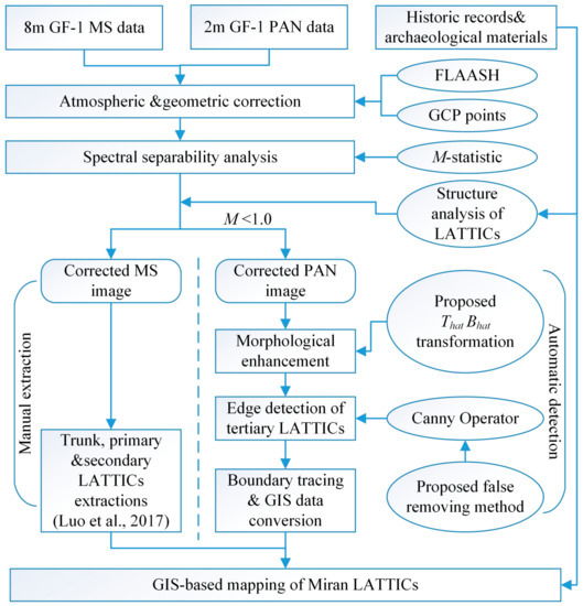 The tuntian system is one of the most significant agricultural development projects in ancient China’s northwest frontier areas and has been studied widely not only because it offers us crucial information on arid agriculture, the military, archaeology, climate change, and the paleoenvironment, but also because it is regarded as a cultural symbol of the Silk Road and precious irrigation heritage. This study proposed an automatic approach to support the extraction of tertiary LATTICs from GF-1 VHR PAN data in the Miran site in northwestern China. In general, the tuntian irrigation canals appeared as linear archaeological traces with poor contrast in multispectral imagery. This study proposed a new method consisting of morphological joint bottom–top transformation, an improved Canny edge operator, and GIS tools. The performances were 94.32% for the experimental image, and 97.12% and 90.68% for test images I and II, respectively. These results indicate an impressive agreement with visual interpretation. The results revealed that the proposed method performed well in tertiary LATTICs extraction despite the buried state of traces in the study region.