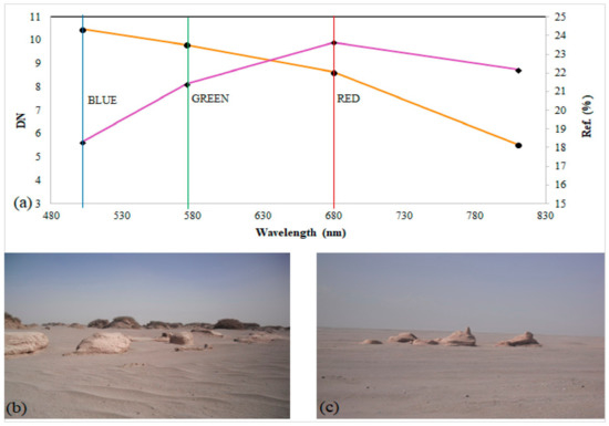 The spectral profiles of LATTICs before (orange DN values) and after (purple reflectance values) atmospheric correction using FLAASH (a); and the canals have high optical reflectance values due to being buried under gravel and sand deposits (b,c).