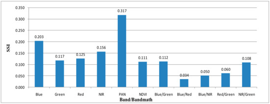 where and represent the means of two classes (LATTICs and their surroundings), and and are their standard deviations. A large SSI indicates good separation between the two classes since within-class variance is minimized and between-class variance is maximized [54]. Following Kaufman and Remer [53], SSI > 1.0 and SSI < 1.0 indicate good and poor class separation, respectively. The SSI assesses the separability for LATTICs and each archaeological class pair. Furthermore, it allows for an examination of spectral separability among substrate classes and the identification of indices that are important for classification. Spectral separability analysis was carried out to compare the spectral separability of LATTICs for the GF-1 PAN image with GF-1 MS images and their products (e.g., spectral indices and PCA).