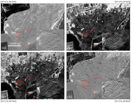 This was caused by Miran LATTICs, which have no distinctive spectral signature, being completely buried beneath layers of aeolian sand deposits and gravels (Figure 5b,c). Thus, it was difficult to distinguish TICs from background information using spectral classification. In these situations, we applied GF-1 PAN data for detecting tertiary LATTICs based on their textural characteristics, which has been a crucial factor in visual interpretation.
