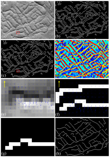 Results of edge detection applied to the area enclosed by the red box in Figure 7d: (a) morphologically enhanced image; (b) results of the Canny operator; (c) results of the geometric filter; (d) gradient direction map of (a); (e) gradient vector sub-map covering the area enclosed by red boxes in (a); (f) gradient vector displayed on the red boxes in (c); (g) image in (f) after shadow edge removal; and (h) the edges in (a) after the removal of false edges. The blue and yellow arrows in (e,f) represent the gradient vectors and the directional illumination vectors in the image plane, respectively.
