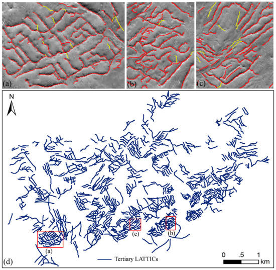The same approach was used to extract tertiary LATTICs in two test images (I and II) to assess the method used in this study. LATTICs with a total length of 1384 m (Figure 9b) and 1367 m (Figure 9c) were extracted from Test I and Test II with an accuracy of 97.12% (1415 m/1457 m) and 90.68% (1362 m/1502 m), respectively. Thus, the proposed method performed well for extracting tertiary LATTICs in the Miran site. The visual interpretation method extracted 754 tertiary LATTICs of various sizes in our previous study [3]. Figure 9d shows the automatic extraction results of tertiary LATTICs for the entire Miran site with an average accuracy of 95.76%.