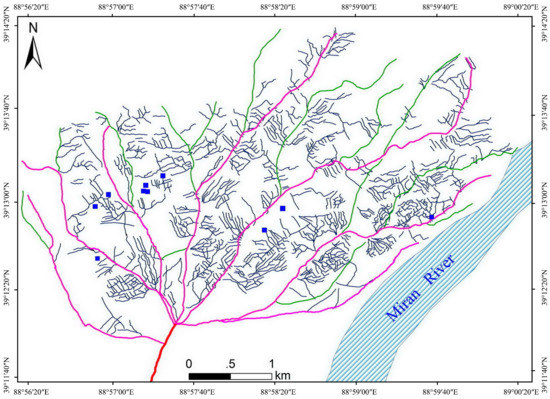 The primary objective of this study was to create a map to help understand the irrigation structure of the tuntian landscape. In a previous study, trunk, primary, and secondary LATTICs were visually interpreted in ArcGIS [3]. In this study, a map of tertiary LATTICs was also made in ArcGIS by digitally converting the automatic extraction results to polyline features. Figure 10 shows the integrated map of all LATTICs in the Miran site.