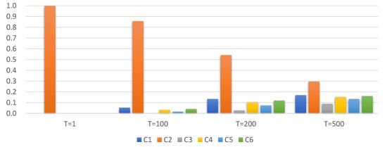 An example of categorical probability distributions of high-temperature softmax output with different temperature. C1∼C6 denote six categories. The input logit data are listed in the last row of Table 1. When (normal softmax), the probability of C2 tends to 1 and others tend to 0. If T goes higher, the categorical distribution tends to be more consistent.