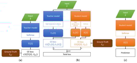 where and denote the T-temperature softmax output of the student model and the teacher model respectively. In extreme conditions, such as lacking of training samples, the teacher’s high-temperature output can even provide supervision to the student model without any ground truth data (set ). In prediction or production environment, the trained student model only outputs normal softmax result, as shown in Figure 2c.