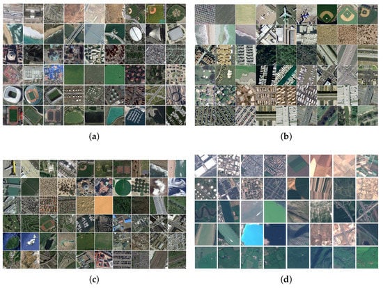 Sample images in (a) AID dataset; (b) UCMerced dataset; (c) NWPU-RESISC dataset; and (d) EuroSAT dataset.