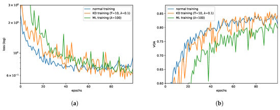 - KD training is effective. It could increase OA by approximately 3%, compared to the direct training way. However, ML training did not seem to work or even reduce the OA. For further analysis, we draw the validation loss curves and VOA curves of these three types of training methods, which are shown in Figure 4a,b. From training curves, we could find that direct training leads to faster convergence (50 epochs) but falls into local optima while KD training could always reduce the loss.