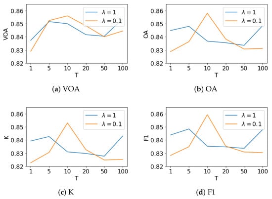 Figure 5. KD training results of different temperature and on AID dataset. These four subfigures demonstrated the relationship between four metrics and the temperature T, according to Table 3. The curves shows that the trend of VOA are similar to other metrics whether or on AID dataset. - From a macro point of view, KD training methods could improve the performance of a network model, in terms of OA, K or F1. In test data evaluation, it even surpassed the deep teacher model by 60% higher speed and using only 2.4% model parameters.