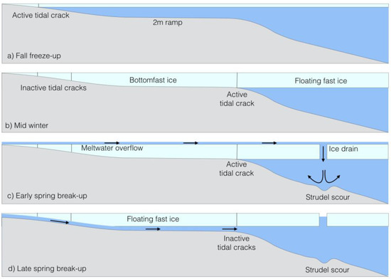 During the early stage of spring melt in Arctic deltas, freshwater will flow on top of the bottomfast ice before reaching floating ice over deeper water. Here, the floating ice may break under the load of the overlaying water. The melt water will drain through cracks in the floating ice, which results in ice drains that can excavate deep into sea floor sediments (Figure 1c). The resulting indentations in the sea floor are known as strudel scours and occur mostly in the primary strudel zone, which is the area directly offshore of the bottomfast ice (an area between the 1.5 and 6 m isobaths) [16,17]. Strudel scour presents a major threat to subsurface infrastructure, particularly buried oil and gas pipelines [17], such as in the case of pipelines extending from the man-made Oooguruk Island near the Colville Delta [18]. In the event that a strudel drain is located directly above a buried subsea pipeline, a sufficiently deep strudel scour may expose the pipeline and lead to an unsupported span of pipeline. A strudel scour that forms directly over a buried pipeline also can remove the backfill material that is needed to prevent damage from ice keels and forestall upheaval buckling [19]. Later in the spring the bottomfast ice will increasingly degrade as melt water starts to flow beneath the ice (Figure 1d) [20].