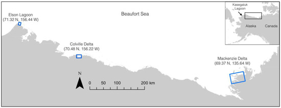 Three locations were used for a validation effort along the Beaufort Sea Coast: the Mackenzie and Colville deltas, as well as the Elson Lagoon (Figure 2). The Mackenzie Delta is one of the largest deltas in the Arctic and the surrounding waters and sea ice are almost completely fresh [12]. The near coastal ice used for validation in this area is first-year and predominately smooth ice. The shallow local bathymetry similar to other Arctic deltas [20] results in a girdle of bottomfast ice several kilometers wide.