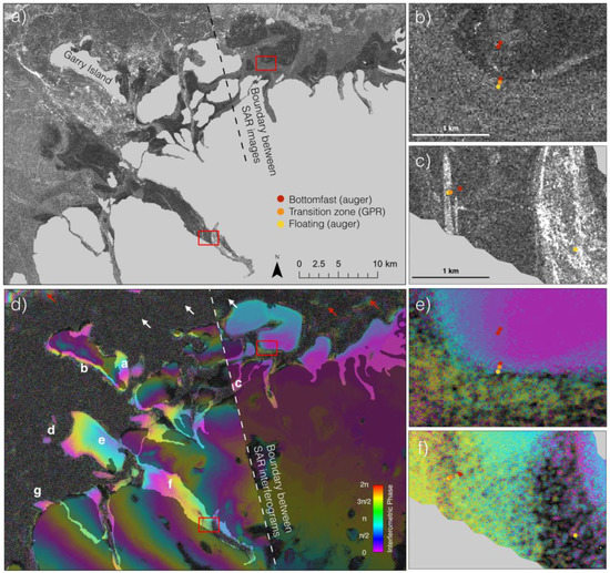 The low bulk salinity of near-coastal ice at this site ensures strong radar return signals from the ice/water interface for floating ice. Hence, bottomfast ice can be identified as low-backscatter regions in PALSAR backscatter images with radar energy penetrating into the seafloor in the absence of an ice/water interface (Figure 3a). This was confirmed by auger measurements in two locations (red and yellow dots in Figure 3b,c). The exact location of the transition zone was obtained using GPR (orange). Compared with the interferograms (constructed between the prior images and the ones featured in Figure 3a,d), the areas featuring reduced backscatter appear with a consistent fringe signature similar to the signature over land (Figure 3d–f).