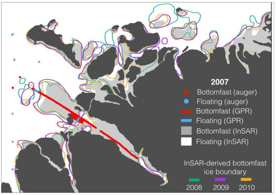 Much of the ice that we assumed to be bottomfast in 2010 was confirmed bottomfast during two field campaigns in 2005/2006 and 2006/2007 (areas a–g in Figure 3d). We further compared a delineation of similar low-phase-ramp interferometric features early in 2007. We used a GPR track and auger measurements of bottomfast ice taken later the same year during the approximate maximum bottomfast ice extent (Figure 4). The in-situ measurements were collected at a later date than the acquisition of the PALSAR images, which results in a larger extent of bottomfast ice in the in-situ data. Even so, there is a clear correlation between the areas determined bottomfast in-situ (red) and using interferometric phase (light gray). Using interferograms from multiple years we tracked how the areas occupied by bottomfast ice persist from year to year (colored lines in Figure 4). InSAR-compatible PALSAR scenes were only available prior to reaching maximum ice thickness, but they indicate reduced bottomfast ice extent during the in-situ campaigns (2007 and 2010) compared to 2008 and 2009.