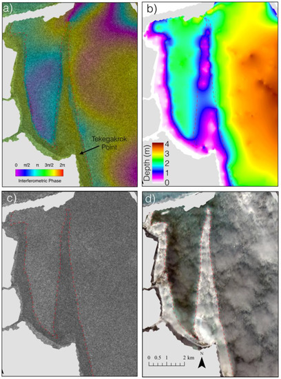 The western Elson Lagoon features shallow near-coastal areas with bottomfast ice. Most noteworthy is a shoal extending northward from Tekegakrok Point. A Sentinel-1 interferogram constructed over the area during spring 2017 is displayed in Figure 6a. Detailed bathymetry points were collected in Elson Lagoon in July 2015 with high-resolution DGPS and a single-beam sonar with 2.3 cm and 4.6 cm accuracy in the horizontal and vertical respectively and interpolated into a 10 m resolution surface [42] (Figure 6b). The interferogram displays constant phase values along the shallow western coastline as well as along the shoal consistent with the local bathymetry shown in Figure 6b.
