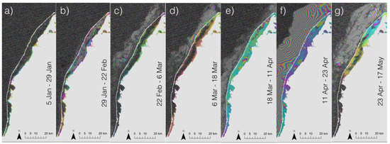 Although delineation of the maximum extent of bottomfast ice can be useful, it can also be valuable to track the evolution of bottomfast ice within a season. This can especially be relevant for on-ice operations where it is necessary to determine exactly when the bottomfast ice forms (i.e., when the ice reaches maximum load bearing capacity). It is also a good measure of lagoon sub-ice aquatic habitat relevant to fish species and benthic organisms. As an example, we constructed seven Sentinel-1 interferograms over Kasegaluk Lagoon in Alaska, during winter and spring 2017 (Figure 7). The 120 km long lagoon is shallow, with an assumed maximum depth of about 4 m, but with most of the lagoon 1–2 m deep [45].
