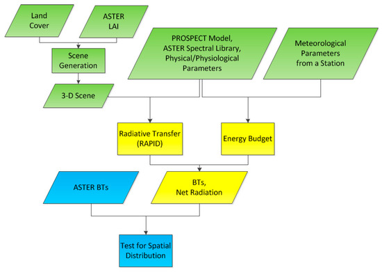A vital goal of this new combined model is to dynamically simulate the distributions of temperatures over complex surfaces. In this section, we assess the performance of the RAPID-EB model using TIR data obtained by the ASTER sensor. An artificial oasis in Northwestern China was selected as a study area. In addition, two days, which are 10 July 2012 and 2 August 2012, were selected for study. Both of these days fell within the summer vegetation growing season and were cloudless. In this evaluation, we did not use a cloud mask. An atmospheric correction of the observed TIR radiance values was performed by converting the top-of-atmosphere (TOA) values to the corresponding TOC values using the Moderate Resolution Atmospheric Transmission (MODTRAN) code [41,42]. The TOC TIR radiance values were then converted to BTs using the Planck function. The scheme that was used to test the combined model can be seen in Figure 2 and details are provided in the following subsections.