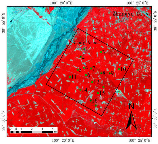 In this paper, the area shown in Figure 3, which has a size of 6.25 km 6.225 km, was selected for the evaluation exercise. This study area is located in an artificial oasis in the middle reaches of the Heihe River in the Gansu province of China. During the summer of 2012, this area was selected as a key experimental area where intensive and long-term observations were collected during the HiWATER (The Heihe Watershed Allied Telemetry Experimental Research) project [43]. During the summer, maize is the major agriculture crop and all of the vegetated area was assumed to be occupied by maize in the evaluation process. In addition, building and road pixels exist in this area. In this paper, the roads were represented as bare soil because most of these roads are paved with soil. The surface soil type is silty clay loam. The locations of seventeen automatic meteorological stations are shown in Figure 3 and these stations measured meteorological parameters during the HiWATER project [44]. This selected area is a typical irrigation district. The precipitation in this area is approximately 100–250 mm per year, but the potential evaporation is as high as 1200–1800 mm per year [43]. The annual average air temperature of this selected area is 280.45 K [45].