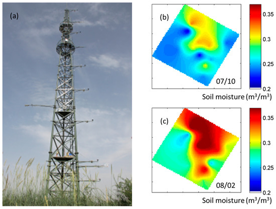 The meteorological data were obtained from the automatic meteorological stations shown in Figure 3. Meteorological data were collected every 10 minutes and include the air temperature, air humidity, and air pressure at 5.0 m above the ground level. The wind speed and direction is 10.0 m above the ground level, the four-component radiation (downward/upward shortwave and longwave radiation) is 6.0 m above the ground level, and the soil moisture has depths of 2.0 cm and 4.0 cm. The Daman Super Station (i.e., station15) is a 40 m boundary-layer tower located at 100°22′ E, 38°51′ N. This station is surrounded by maize canopies, which is shown in Figure 5a and provides air temperatures and wind speeds at heights of 3.0 m, 20.0 m, 30.0 m, and 40.0 m. The air temperature, air humidity, air pressure, and wind speed values are considered to be the same over the study area as a whole and those obtained from the Daman Super Station were entered into the RAPID-EB model. The soil surface moisture was obtained by interpolating the measured values from the 17 automatic meteorological stations. Figure 5b,c show the spatial distribution of the soil surface (0 cm to 5 cm) moisture on the two selected days and this quantity was calculated by averaging the measured data at the 2.0-cm and 4.0-cm depths. The soil moisture mainly varied from 0.25 to 0.35 m3/m3, which represents well-irrigated conditions for agricultural crops.