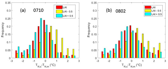 Histograms of the differences in temperature between the simulated and observed values with different LAI errors correspond to (a) 10 July 2012 and (b) 2 August 2012.