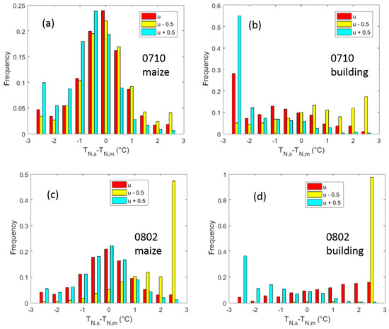 Histograms of the differences in temperature between the simulated and observed values with different wind speed errors on (a,b) 10 July 2012 and (c,d) 2 August 2012. (a,c) refer to vegetation pixels, and (b,d) refer to building pixels.