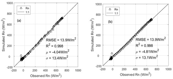 Scatterplots showing the relationship between the simulated and measured net radiation on (a) 10 July 2012 and (b) 2 August 2012. In total, 144 pairs of measurements were used for each day.