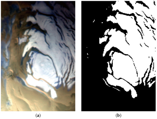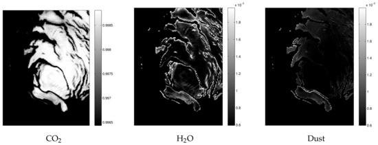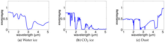 Since the main goal of this article is to evaluate the validity of the linear mixture model for unsupervised identification and mapping of ices and, to a lesser extent, the minerals that are found on the planet Mars, based on images acquired by the instrument OMEGA, we focus on a polar case study implying compounds such as CO2, H2O and mineral dust. The reason for this choice is the availability of large time series of OMEGA observations acquired above the Martian poles and the numerous, distinctive and often overlapping absorption bands that characterize the icy materials on Mars. In addition, a full analysis of their spectra by the inversion of reflectance radiative transfer models is sometimes feasible [56,57,58], even though such a type of analysis requires substantially more numerical effort. In this article, the physical approach provides reference maps in order to validate the considered methods for dataset exploration.