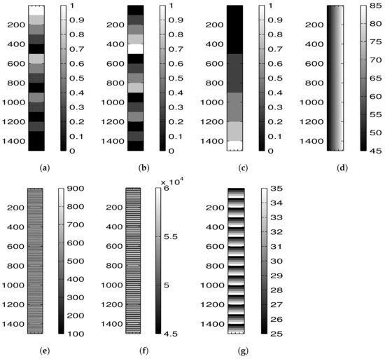 The spatial distribution of the parameters for simulating the synthetic data. The dimension of each image is pixels. For visualization, all the values of these parameters are normalized to [0, 255]. The scale of the parameters related to the gray values in the image are shown on the color bars to the right of each image. (a) Abundance of H2O ice; (b) abundance of CO2 ice; (c) abundance of dust; (d) solar angle (in degrees); (e) grain sizes G of H2O ice; (f) grain sizes G of CO2 ice; (g) grain sizes G of dust.