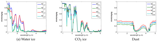 In this section, we again simulate a linear mixture of spectra corresponding to three typical compounds present on the surface of the south pole of Mars , according to typical observation conditions and to the properties of the OMEGA instrument. However, this time, we apply spectral non-linear effects caused by the variations in the acquisition geometry and in the grain sizes of the materials. The incidence angle varies from 45 degrees–85 degrees, with an increment of two degrees. The grain sizes G of the three materials vary according to ranges typical of Martian conditions and are tabulated in Table 4. Similar parameter values were used for simulating the materials on the polar regions of Mars in [66]. The spatial distributions of these parameters (shown in Figure 2) reflect the fact that we consider all possible combinations of their values for simulating the synthetic data. The spectra of the three endmembers (when the incidence angles and the grain sizes form combinations of extremal values) are shown in Figure 3. For of clarity, we note these spectra by the notations shown in Table 5. As illustrated by Figure 2, different acquisition geometries and material granularities change the radiative transfer of solar light within the surface according to the wavelength, and this affects the calculated reflectance spectra. Some remarks can be drawn accordingly: