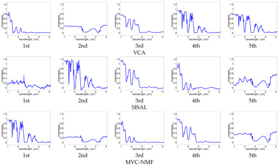 The spectra of the five endmembers extracted by VCA, SISAL and MVC-NMF with the synthetic data.