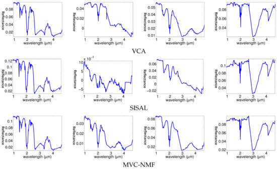 In this article, we select VCA to represent the direct methods. Simplex identification via split augmented Lagrangian (SISAL) and minimum-volume constrained non-negative matrix factorization (MVC-NMF) are selected to represent the advanced methods SISAL, being based on simplex optimization, while MVC-NMF is based on non-negative matrix factorization with an optimal simplex as the regularization term.