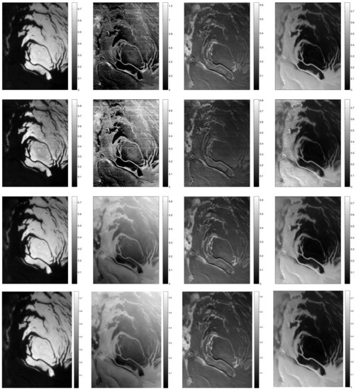 - Bernard-Michel, C.; Douté, S.; Fauvel, M.; Gardes, L.; Girard, S. Retrieval of Mars surface physical properties from OMEGA hyperspectral images using Regularized Sliced Inverse Regression. J. Geophys. Res. 2009, 114. [Google Scholar] [CrossRef]