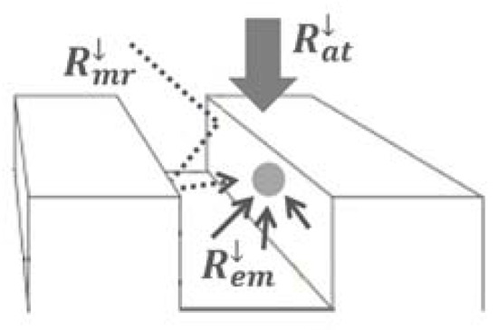 The amount of TIR radiation received at location from the multiple reflections () is estimated based on the capacity of the scene to reflect the TIR radiation coming from the atmosphere and the scene emission. The reflectivity of the scene is expressed as () and the portion of reflected TIR radiation remaining in the urban canopy is estimated based on the terrain view factor as follow: