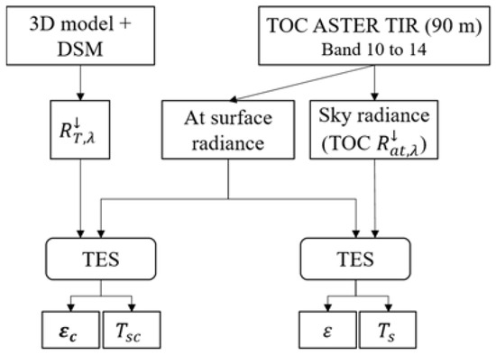 Processing steps to estimate corrected and non-corrected land surface temperature () and emissivity () from ASTER data (TOC = top of canopy, DSM = digital surface model).