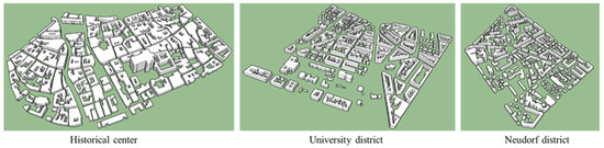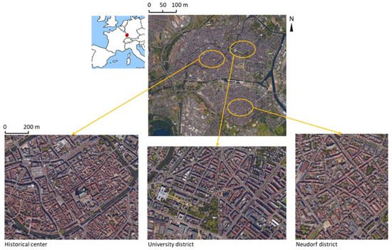 The method is developed and tested over the urban area of Strasbourg. Located in the east of France, this agglomeration covers 78.26 km2 and counts slightly more than 276,000 inhabitants. The effective LSE and the LST are estimated for three districts presenting different urban configurations, the objective being to investigate the impact of the geometric correction and to quantify the errors caused by neglecting the surface geometry. The three districts, namely the historical center, the university district and the Neudorf district, are presented in Figure 3 and their morphological characteristics are summarized in Table 1.