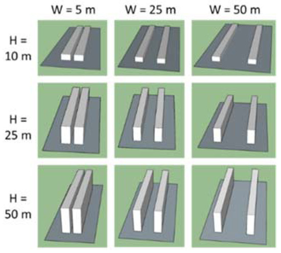 The validation presented in this section compares the total, atmospheric and scene downwelling TIR radiations estimated using the proposed method (hereafter mentioned as ‘estimated’) to the corresponding fine-grained simulated values, computed broadband by the reference 3D model LASER/F (hereafter mentioned as ‘reference’). First, the validation is performed for 27 different canyon configurations with three different building heights (10, 30, 50 m) and street width (5, 25, 50 m) representative of Strasbourg urban area and three different orientations (0, 45, 90°) (Figure 5). Four periods of 3 to 6 clear days taken in March, June, September and December are extracted from a set of meteorological data measured at the ground to force the model. For the fragmentation, the mesh minimum size is set to 15 m2. The albedo, emissivity, and thermal properties of the materials of the scene are detailed in Table 2. Those settings are defined according to the outputs of several experiments carried out with the model over Strasbourg over the past decade [38,43]. In this case, the emissivity is kept constant for all surfaces of the scene, which is not the case in reality. However, this assumption is acceptable as a sensitivity analyses performed with LASER/F showed that varying the emissivity values from 0.85 to 0.95 lead to variations in surface temperature lower than 0.24 °C [38]. The reference values are simulated for each mesh of the scene and then averaged at canyon level. The overall computation time for each period and each configuration considering the described scenes is provided in Appendix to this paper (Table A1).