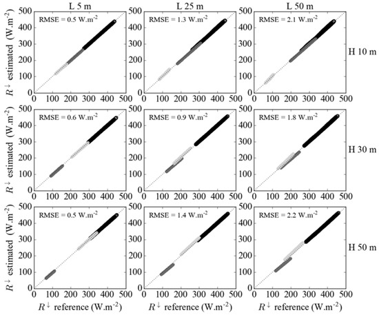 Figure 6 presents a set of nine validation graphs for canyon configurations with different building and street dimensions but the same orientation. The latter was found to have no significant impact on the results. The validation of is divided into atmospheric and scene contributions, the latter comprising the scene emitted radiation and the multiple reflections. Each graph shows represented with black circles, with dark grey dots and with light grey dots along with the RMSE computed for only. A detailed validation of atmospheric and scene contributions is provided further. Figure 6 highlights that very accurate values of can be retrieved using the proposed method based on the geometry characteristics of the canyon. The largest RMSE values (1.8, 2.1 and 2.2 W·m−2) occur for canyons at 50-m streetwide, no matter what the height of the buildings. Both and are also correctly estimated, even if a slight overestimation of the scene contribution and underestimation of the atmospheric contribution can be observed for the canyons with buildings higher than 30 m and streets wider than 25 m. This figure shows that the atmospheric contribution decreases when street width decreases and when building height increases. With building height below 30 m, the atmospheric radiation represents the major contribution to the total downwelling TIR radiation. On the contrary, the scene contribution increases together with building height and decreases when street width increases. Nevertheless, both contributions seem to be more influenced by the height of the building than the street width. The same behavior was observed for the four time periods.