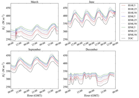 Based on the different canyon configurations and the four time periods spread over the year, the impact of the geometry on the total downwelling TIR radiation is quantified. Figure 7 shows the difference between the non-corrected downwelling TIR radiation at the top of the canopy (TOC) and the computed integrating the impact of the surface geometry for each time period and configuration. Differences up to 68 W·m−2 (25% of the TOC value) are reached after correcting for the geometry. Thus, neglecting the impact of geometry could lead to errors of about 0.05 concerning the surface emissivity and 4 °C for the surface temperature. If expressed as the percentage of TOC-downwelling TIR radiation, the largest differences are obtained in March and December, when the amount of TOC-downwelling TIR radiation is the lowest. For those periods with lower atmospheric contribution, accounting for the scene contribution has a large impact on the total downwelling TIR radiation. In all cases, the largest differences are observed for canyons with tall buildings and narrow streets. As previously, those differences appear to be more linked to the building height than to the street width. No significant correlation between the height/width ratio of the canyons and those differences could be highlighted.
