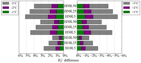 As for the atmospheric contribution, the accuracy of the scene contribution estimation is directly linked to the . However, it also depends on the LST of the different elements of the canyon and the assumptions made to estimate the emitted radiation. This LST is estimated at mesh level using the 3D thermo-radiative model LASER/F in order to consider the non-isothermal behavior of the pixel. Very large temperature differences can be observed in an urban canyon, especially around solar noon. A sensitivity analysis is carried out to quantify the impact of a variation of the LST on the final estimation. To do so, is estimated using the LST simulated by the model increased or decreased by 1, 2 or 5 °C. The differences are computed as percentage of the value derive from the original LST as shown in Figure 8.