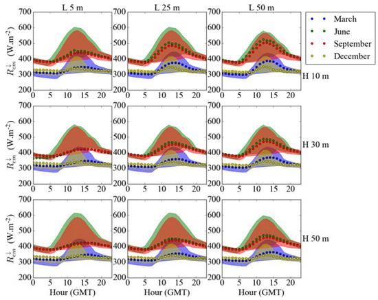 To illustrate the necessity to consider a pixel as non-isothermal, Figure 9 shows the variability of the amount of radiation emitted by the scene according to the LST value used to estimate it (Equation [9]). The dots represent estimated according to the proposed method and the error areas are estimated taking the minimum and maximum LST values observed over the scene for each canyon configuration for each time step. The figure presents hourly estimates for four clear days selected in March (blue), June (green), September (red) and December (yellow). The largest errors areas are observed in June and September, when the range of LST values observed over each scene is the wider. In most of the cases, the isothermal assumption would lead to an overestimation of the contribution of the scene (maximum +196 W·m−2), except for canyon with low buildings and large streets.