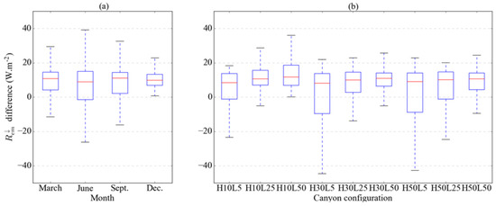 Distribution of the differences between hourly scene emitted radiation estimated integrating the 3D geometry and assuming a flat surface, by month (a) and by canyon configuration (b). The red line being the median value, the upper and lower limits of the box the upper and lower quartile respectively and the whiskers representing the minimum and maximum values.