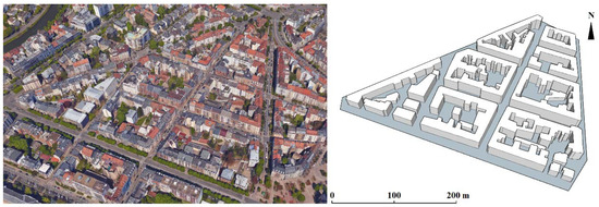 After validating the proposed method to derive integrating all the contributions over different canyon configurations, the method is applied and tested over a larger and more complex scene. This case deals with a real scene, extracted from the BD Topo covering the Strasbourg urban area (Figure 11). The average building height of the scene is 21.5 m and the average street width is 13.5 m.