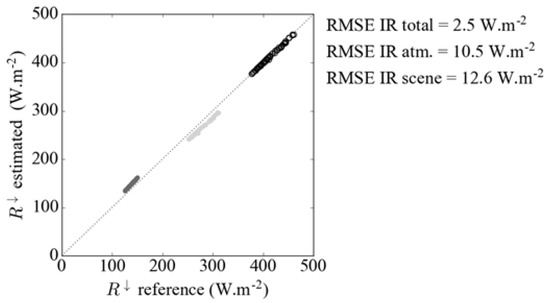 Comparison of estimated and reference total (black circles), atmospheric (dark grey dots) and scene (light grey dots) downwelling TIR radiation for a whole district.