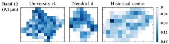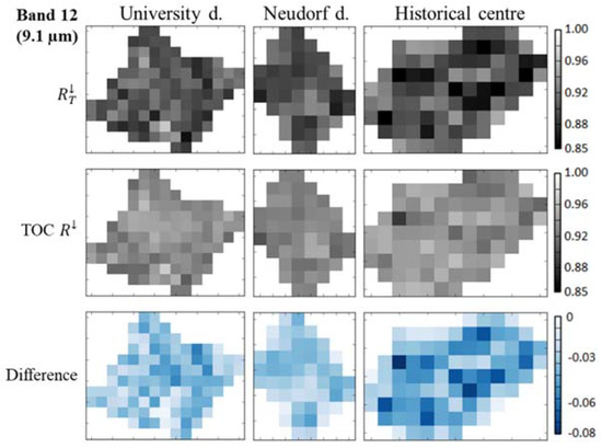 Figure 13 provides two LSE maps derived using the TES algorithm applied over the ASTER image for the three selected districts. The first row of the figure shows a LSE map derived using the total downwelling TIR radiation () derived from the proposed method for each ASTER pixel. The second row shows the LSE map derived using the TOC downwelling TIR, without geometric correction radiation (TOC ). The last row shows the difference between those two maps. The results are displayed for the band 12 (9.1 μm), as it is the band showing the largest differences. The statistics derived for each ASTER band are provided in Table 5. Figure 13 along with Table 5 show that integrating the impact of the surface geometry when deriving LSE from ASTER data highlights the heterogeneity inside the three districts. It also points out that, without correction, the effective emissivity is likely to be overestimated. The largest differences between corrected and non-corrected LSE is observed for the historical center, this district presenting the highest average building height (Table 1). The university district, which has a similar average building height but lower building density, is less affected by the correction. However, the Neudorf district, which presents the highest building density and the lowest average building height, is the district with the lower difference. This confirms that the building height is a key morphological parameter to account for when mapping LSE.