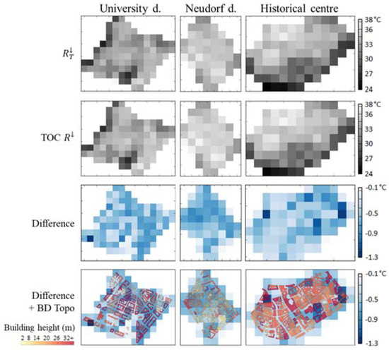 LST maps derived from ASTER for each district using total downwelling TIR radiation (, 1st row), top-of-canopy-downwelling TIR radiation (TOC , 2nd row), the difference between both (3rd row) and difference between both + building footprints (4th row).