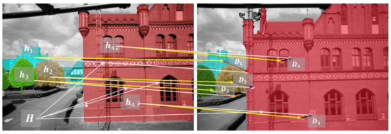 From Equation (8), the approximation of the local homography using the matrix should be valid only at the feature pair . Actually, might change dramatically over the same surface represented by the local homography , especially in cases where that surface is not facing the camera. Moreover, does not have to be unique, as from Equation (7), the entries of can be chosen arbitrarily as long as the equation is valid. Consequently, instead of computing the local homography from Equation (9), it is more practical to estimate the discrepancy vector corresponding to the pair and use it in Equation (6) to find an approximation for the feature