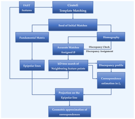 The proposed method in this paper is of a different structure than any common feature matching method. Usually, feature detection, description, and preliminary matching are done separately from the model estimation. In the proposed method, feature matching and model estimation are achieved concurrently. Thus, the proposed method competes against the combination of descriptor assignment, preliminary matching, and model estimation. The method starts with finding a small set of matched features in an image pair, which we call the seed of matches. To make the method self-contained, and to ensure that the method is being fully descriptor-less, the seed of matches is found using template matching. As the regular template matching is neither scale-aware nor orientation-aware, the Ciratefi method [25] is used in cases of significant difference in scale, orientation, or both between the pair of images. From the seed, an initial fundamental matrix and a global homography could be obtained. The next step is to detect the features in the two images. We favour FAST detector for this task, as it is more rapid and inexpensive to compute compared with other feature detectors. Once a feature is detected in one of the images (the left image), an approximate position of the corresponding feature in the other image (the right image) can be obtained using the geometrical information from the homography and fundamental matrix. The geometrical approximation is discussed in detail in later subsections. The predicted position of the features is expected to be inaccurate, as it is affected by the inaccuracy of the fundamental and homography matrices. However, the rough prediction of the features’ positions allows us to locate small regions of interest around these features by narrowing the search space of feature correspondences. To retain the accurate positions of the corresponding features, we employ template matching via normalised cross-correlation (NCC) over the regions of interest around the predicted features’ positions.