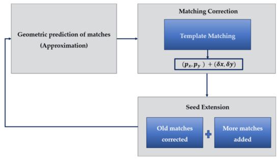 Without discarding the old matches, adding more correct matches to the seed enables re-computing a new homography and a new fundamental matrix. Thus, we increase the size of the seed by adding new matches while concurrently refining the geometrical entities. The algorithm can be recursively repeated until we find an acceptable number of uniformly distributed matches along with an accurate fundamental matrix. In cases of image pairs of different orientation, different scale, or both, the single value decomposition (SVD) is utilised to compute the scale and distortion parameters between the image pair from the initial homography. Then, they can be recursively re-computed whenever the homography is refined. The scale and orientation are applied to the templates while performing the NCC.